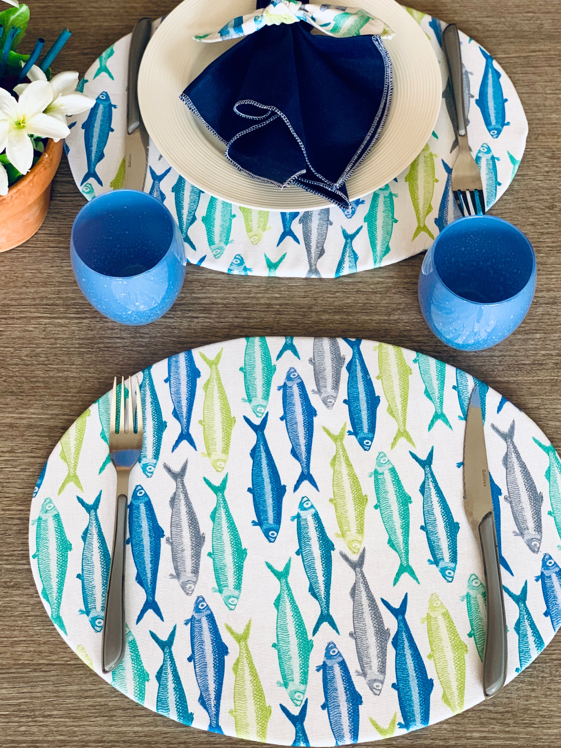 La stampa del kit è nella fantasia di svariati pesciolini, una fantasia senza tempo, e con diverse possibilità di abbinamenti.